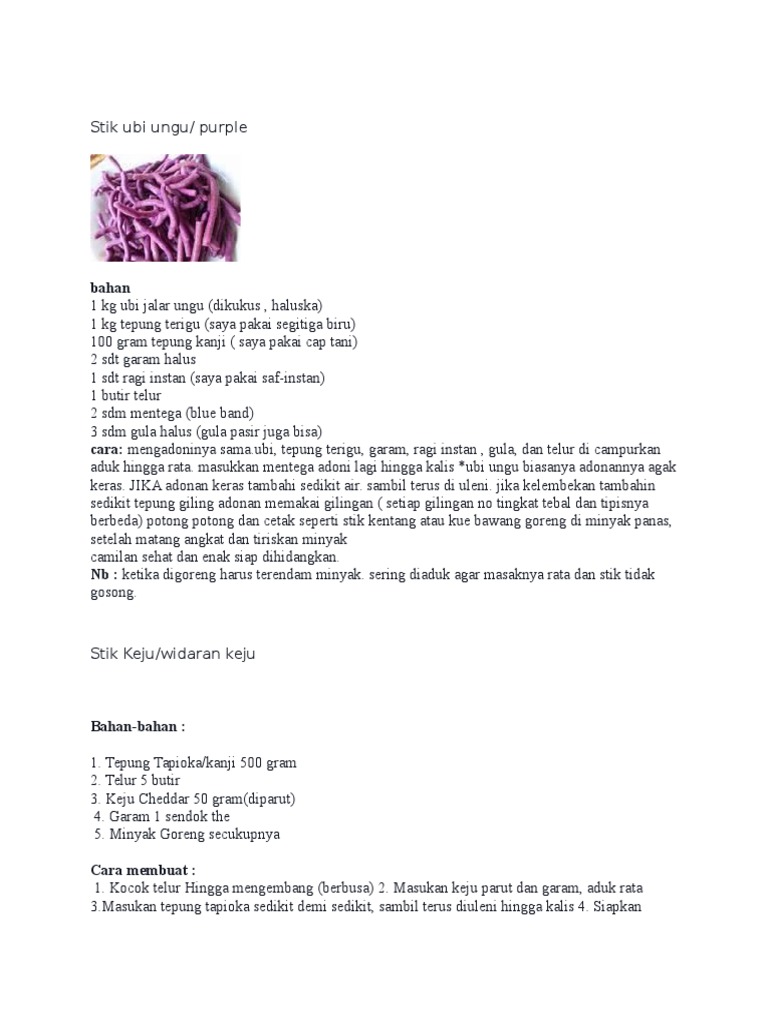 Resep membuat stik ubi ungu enak gurih dan mudah. Resep kue stik bawang ubi ungu renyah dan gurih. Mau kamu menggunakan ubi jalar, ubi ungu, atau ubi jenis lainnya, rasanya akan tetap enak, kok. Dikasih stik sebagai pegangan es saat menikmati kelezatan es krim ubi ungu. 1/4 sendok teh vanili bubuk